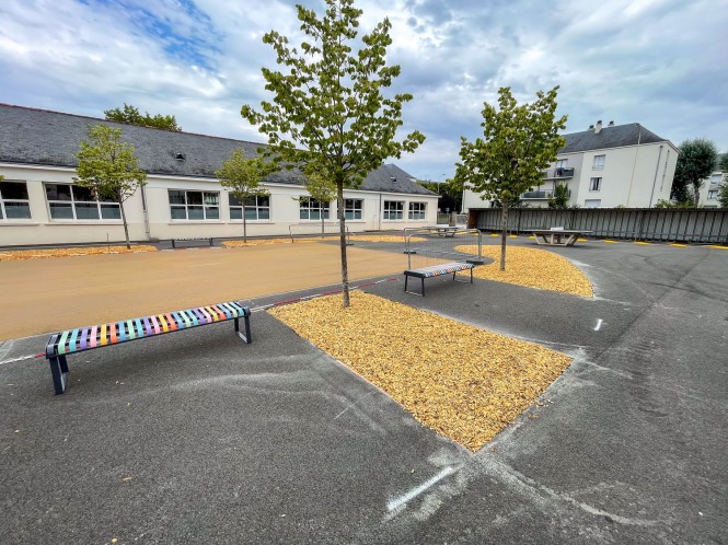 La première phase des travaux avait pour objectif de créer des enrobés clairs (beige, ocre) permettant de moins emmagasiner de chaleur par rapport à des enrobés noirs. Les espaces autour des arbres existants ont été élargis leur permettant à terme de mieux se développer et capter un maximum d’eau de pluie des cours d’écoles.