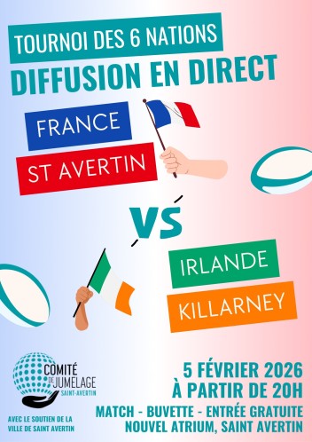 A l'initiative de ses jeunes membres, et avec le soutien de la ville de Saint Avertin, le Comité de jumelage vous propose de participer à la retransmission en direct du match de rugby France-Irlande qui se jouera dans le cadre du tournoi des six nations.